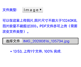 * 点“选择文件”按钮就开始选择并上传图片,如果上传成功,底下有行小字提示“100%完成”;可以继续点“选择文件”,直到所有图片传完。