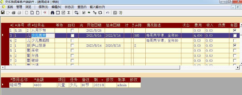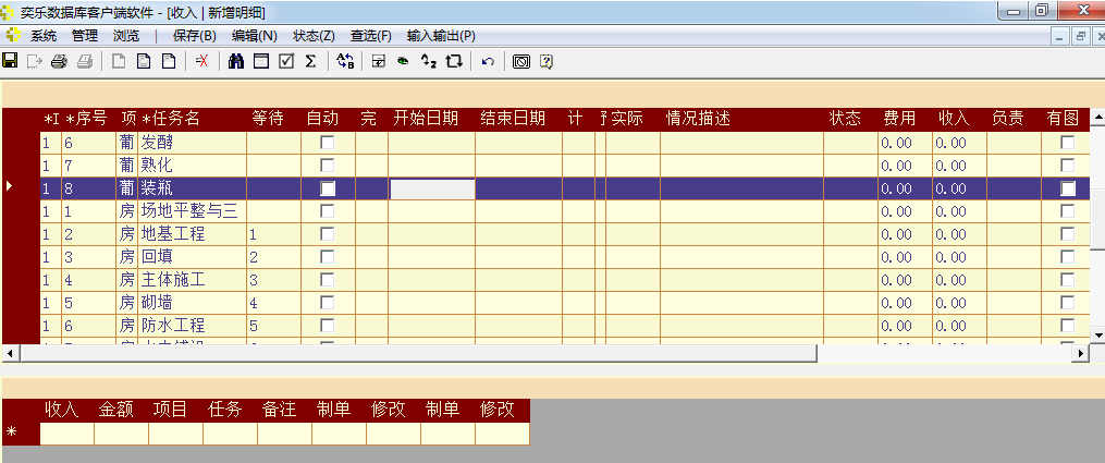 如果项目过程中有收入,可以在"收入"窗口输入,每笔收入要记录在项目中的任务名下,因此此窗口的上层表是任务列表。
