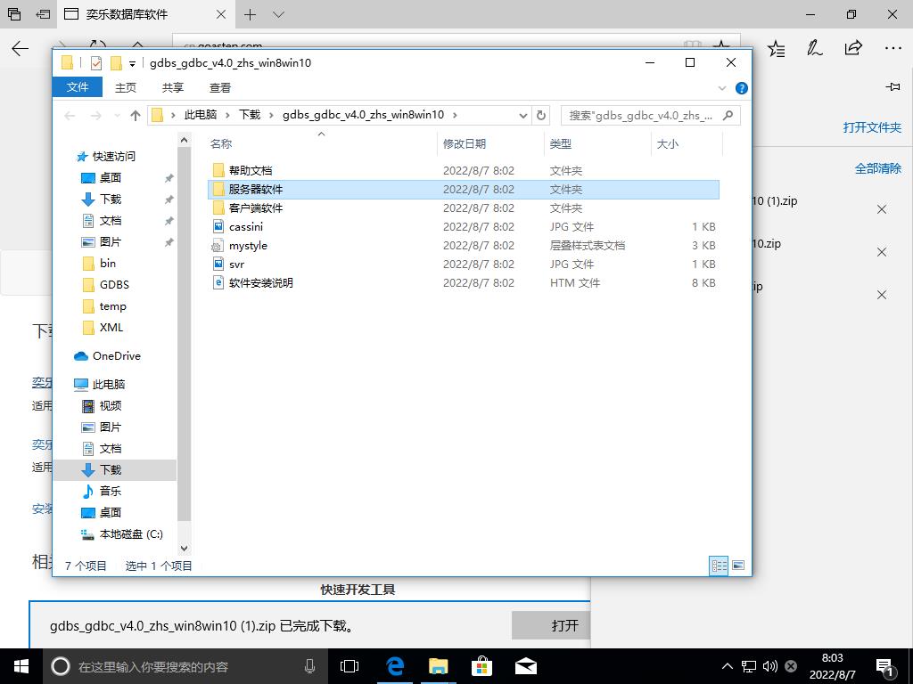 ![]() 解压缩完成后,会显示一个新文件夹,这次菜单上没有解压缩或者提取全部文件命令,说明这是一个普通的文件夹。 文件夹中包含了“服务器软件”和“客户端软件”,客户端软件是免安装的,因此只有服务器软件需要安装,如果以前装有旧版本服务器软件,安装程序能自动识别需要全新安装还是升级。 |