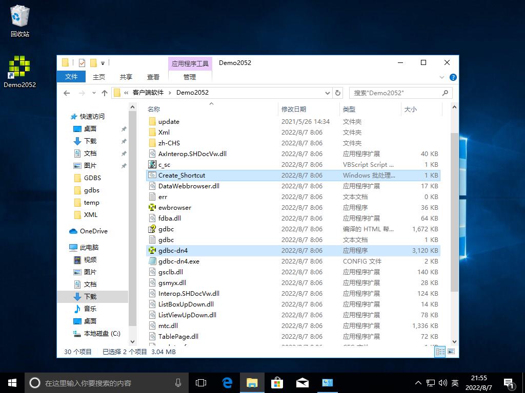 ![]() 找 到主程序“gdbc-x64.exe”(4.x版的主程序名为“gdbc-dn4.exe”,这是一个32位的程序,5.0版以后客户端主程序是64位的,因此使用新名称), 双击运行它。因为每次定位“gdbc-x64.exe”文件位置也挺麻烦,可以在桌面上为它创建一个快捷方式,双击“Create_Shortcut”命 令, 桌面上会出现一个名为“Demo2052”的软件图标, 以后双击它,这和运行“gdbc-x64.exe”主程序是一样的。 |