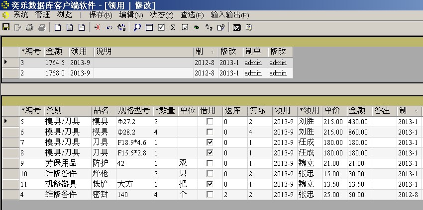 在此窗口输入物品领用的数据,上层表格中,至少应该输入领用日期,同一日期领用的物品,可以做成一张领用清单,输在下层表格中。选菜单“状态”->“新增”新增一张领用清单,选菜单“状态”->“修改”将修改已输入的领用清单,选菜单“状态”->“新增明细”在已输入的领用清单下追加物品信息。
