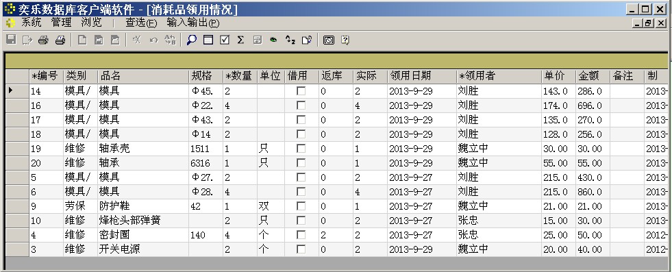 并且统计各类用品采购、领用、库存、报损的情况,它也可以区别借用与消耗,借用的物品是需要还库的,可以统计借用在外的物品(工具)情况。