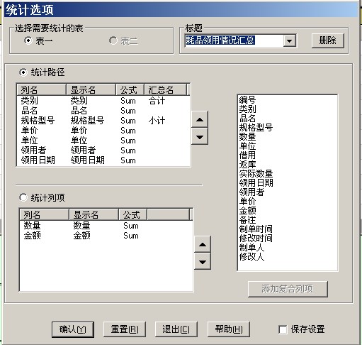 在“消耗品领用情况”窗口,可看到消耗品领用的明细情况,要汇总统计,选菜单“输入输出”->“统计并导出”,在对话框中选标题“耗品领用情况汇总”,