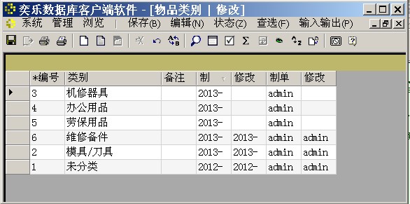 选菜单“状态”->“新增”新增一个物品类别名,选菜单“状态”->“修改”将更改已有的类别名(注意已入库物品的类别名称也会改变)。