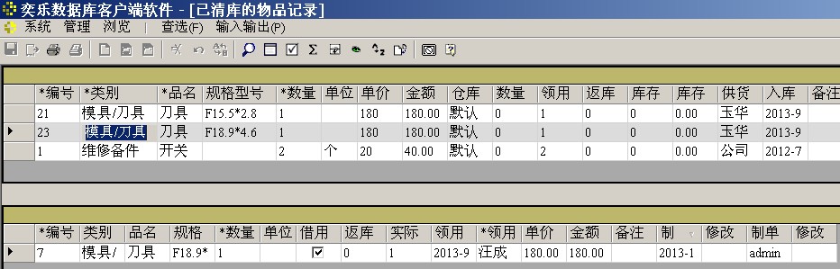 在“已清库的物品记录”窗口,可看到已清库物品的明细情况,在下层表格中显示的是已清库物品的领用情况。
