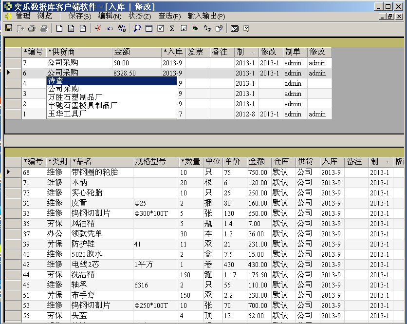 在此窗口输入采购物品的入库数据,带星号的字段都是必填的。选菜单“状态”->“新增”新增一张采购发票,选菜单“状态”->“修改”将修改已输入的采购发票,选菜单“状态”->“新增明细”在已输入的采购发票下追加物品信息。