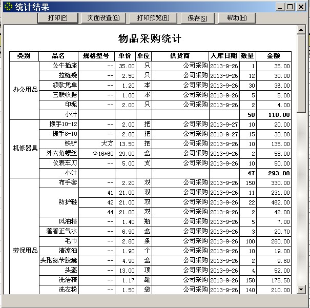 在“采购入库情况”窗口,可看到采购入库物品的明细情况,要汇总统计,选菜单“输入输出”->“统计并导出”,在对话框中选标题“物品采购统计”,