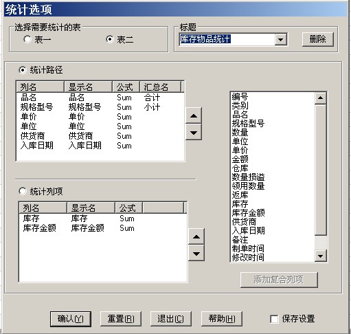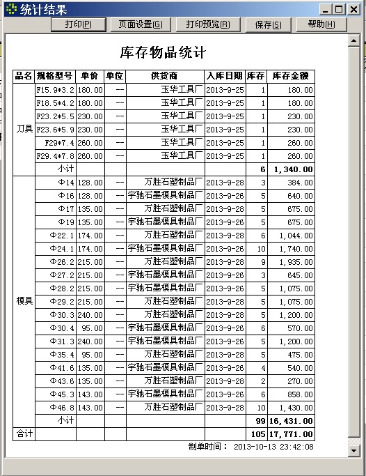 在“现有库存”窗口,可看到在库的物品(工具)的明细情况,要汇总统计,选菜单“输入输出”->“统计并导出”,在对话框中选标题“库存物品统计”,