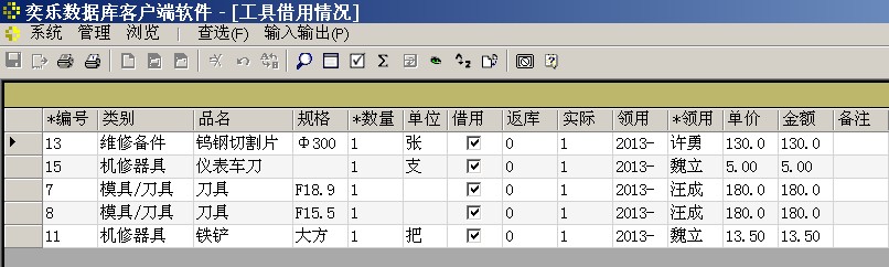 注意, 在下层表格中必须按F8,在打开的对话框中选择库存的物品,不可手工填入,如果是借用的物品(工具),要勾上“借用”。
