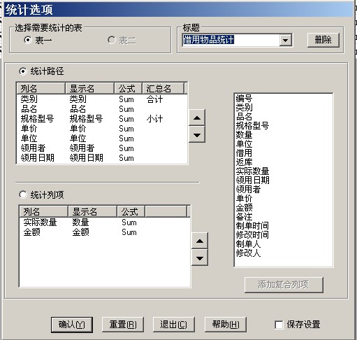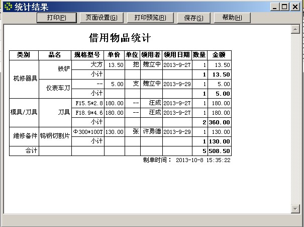 在“工具借用情况”窗口,可看到物品(工具)借用的明细情况,要汇总统计,选菜单“输入输出”->“统计并导出”,在对话框中选标题“借用物品统计”,