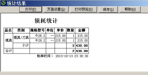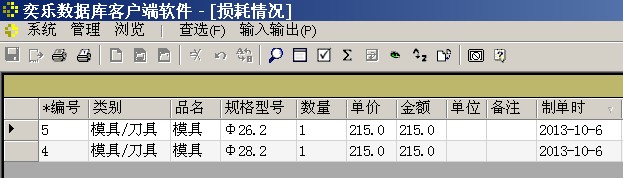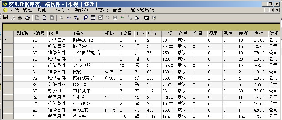 “报损”窗口显示目前库存的物品(工具),在行头输入损耗数量,再按“保存”键,将完成报损。要修改报损记录到“更改报损记录”窗口。