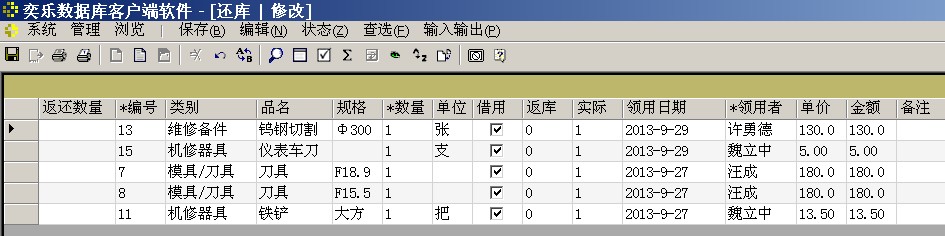 “还库”窗口显示目前借用在外的物品(工具),在行头输入还库数量,再按“保存”键,将完成还库。